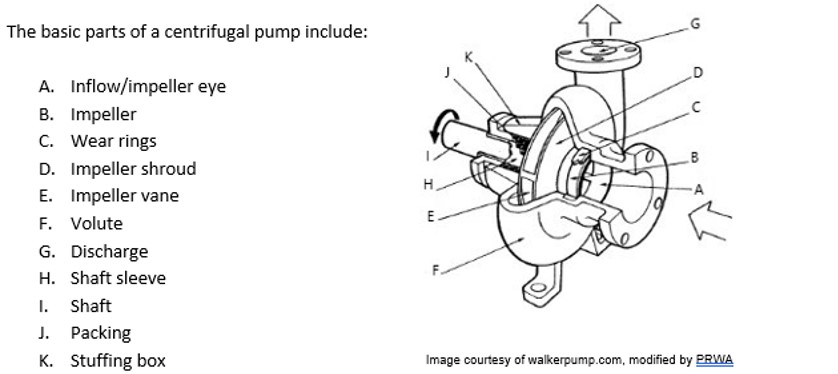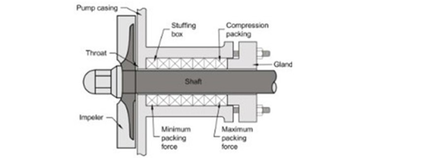 Packing – seals the opening where the shaft passes through the pump casing. The packing is lubricated by water and should drip 10 to 15 times per minute. If the packing nuts are too tight, it will drip less than that which indicates the packing is not getting enough water to be properly lubricated and will cause packing failure. Packing can be replaced by mechanical seals.