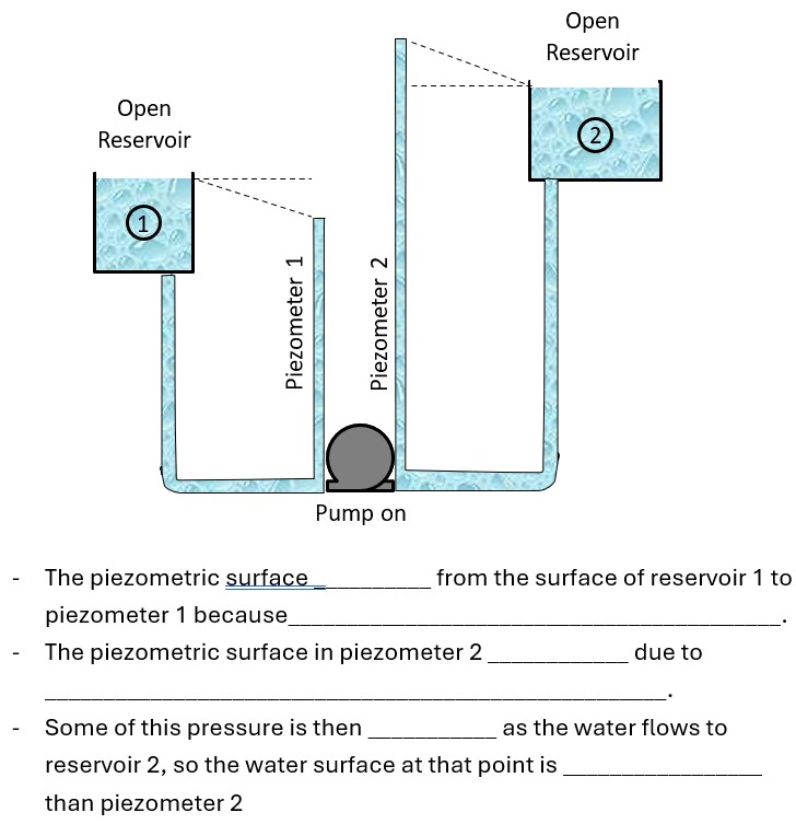 2. Fill in the blanks to best explain the different levels of the piezometric surfaces in the diagram.