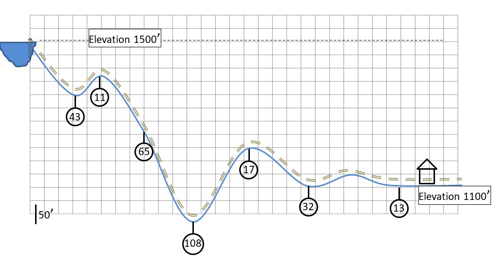 3. In the figure, pressure gauge readings along a water line are shown in pounds per square inch gauge. From this information, locate and draw the HGL.