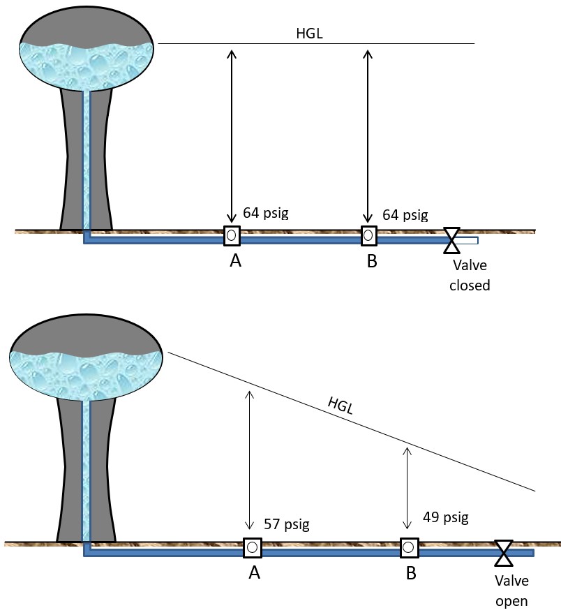 • If the valves 1, 2, and 3 are closed simultaneously (which could be done by remote control), what is the static pressure head in pounds per square inch gauge on each valve?File not found: /var/www/html/learnh2o-prod/web/../../../../../../../mnt/schwebdev/shared/learnh2o-simplyxml/Courses/06116 Basic Hydraulics/06116 05 Head and Head Loss.dita_image24 2.jpg